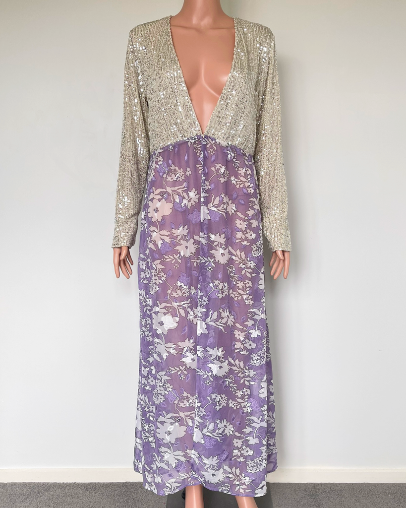 Augustine Resort full length duster coat with sequinned, long sleeved top and purple and white sheer floral fabric from the waist down. Fastens with a large hook and eye clasp at the waist.