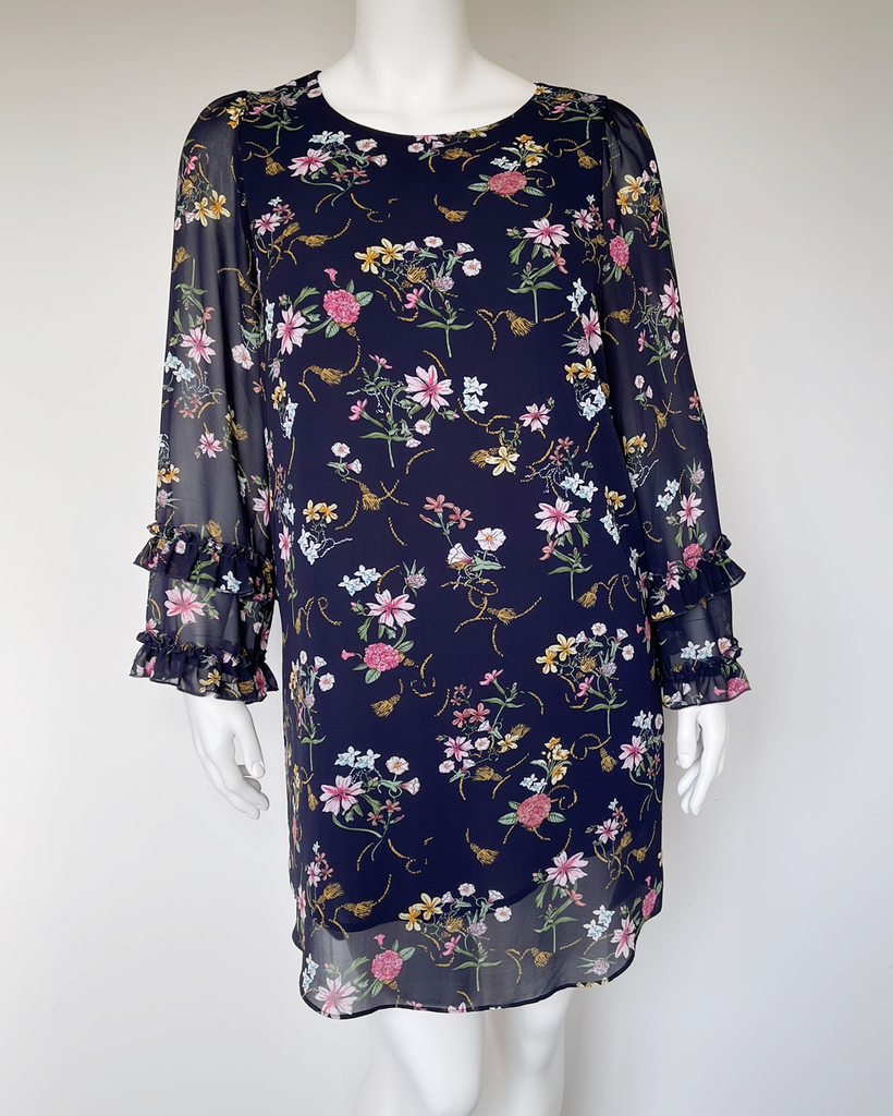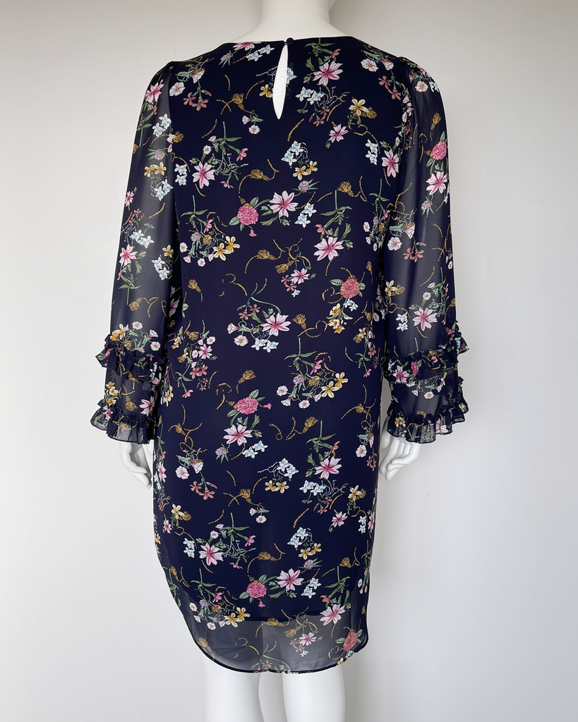 Dark blue floral long sleeved dress with button at the back of the neck from Gloss by Shine On.