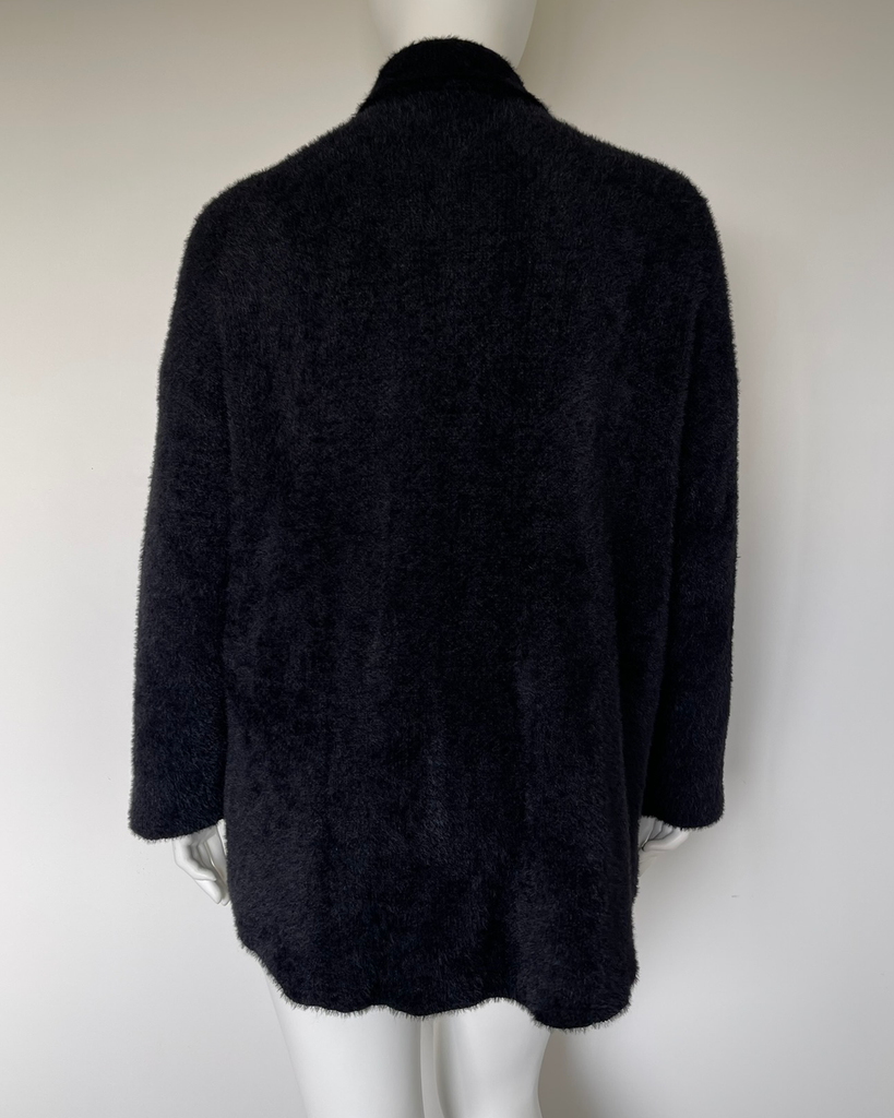 Black fluffy long sleeved stretchy knit shacket with buttons down the front and button up pockets on the chest from US plus sized brand Torrid.