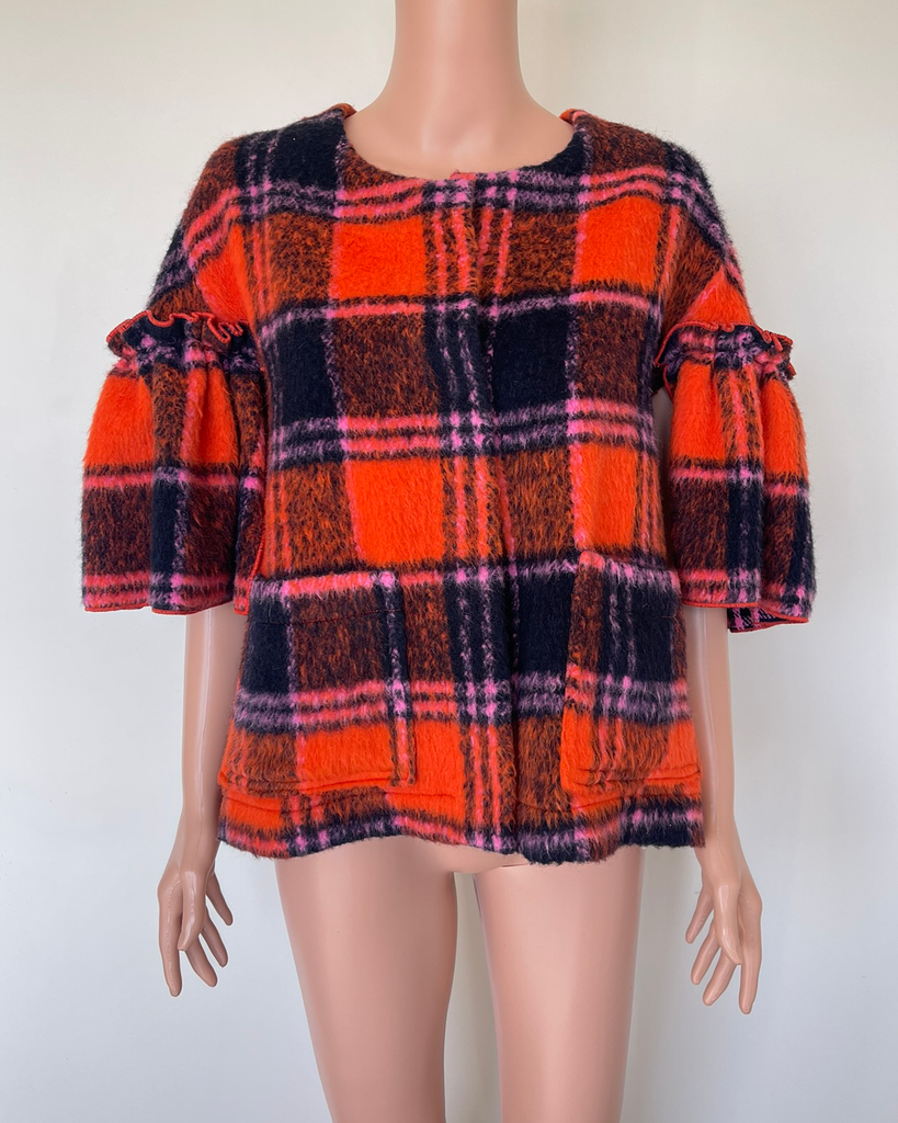 Orange, pink and black cropped length jacket with pockets at the hips and one large dome on the front to close it from Briarwood. This jacket is super thick and warm like a blanket. The frill sleeves are actually cape-like - they sit like normal sleeves but are open along the inside arm. Original retail price would have been around $400.