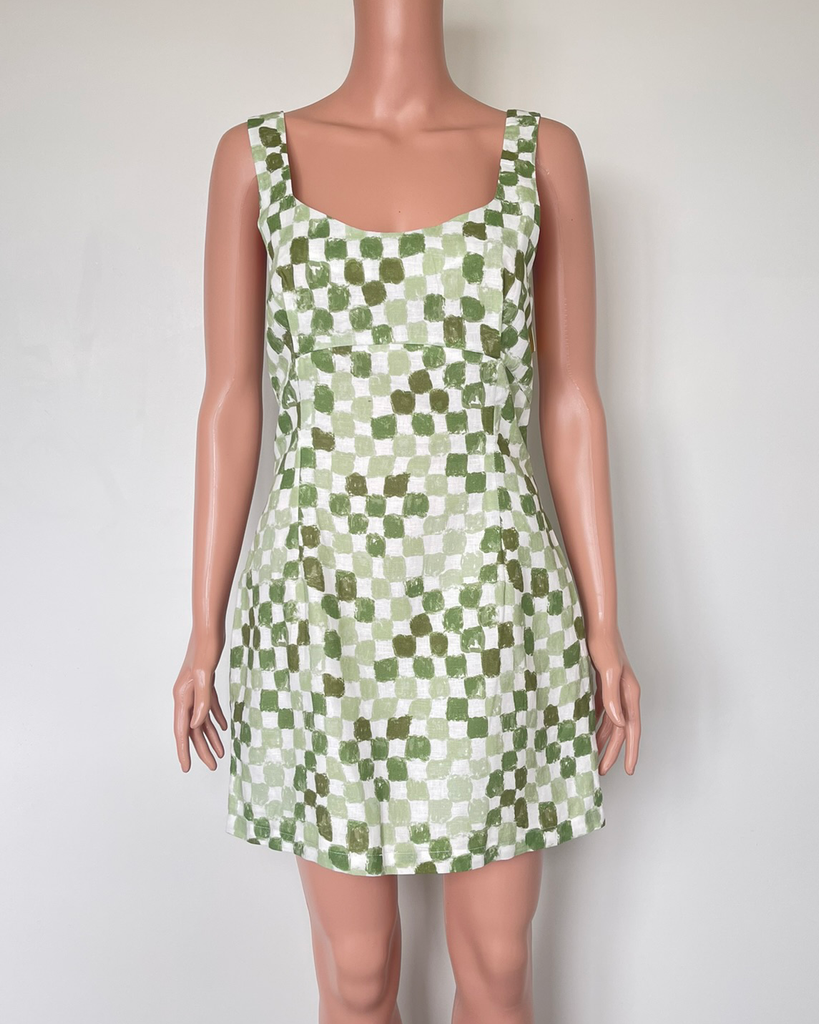 Brand new with tags green and white check mini dress with zip up the back from Australian brand Charlie Holiday. Original price was $164.95NZ.