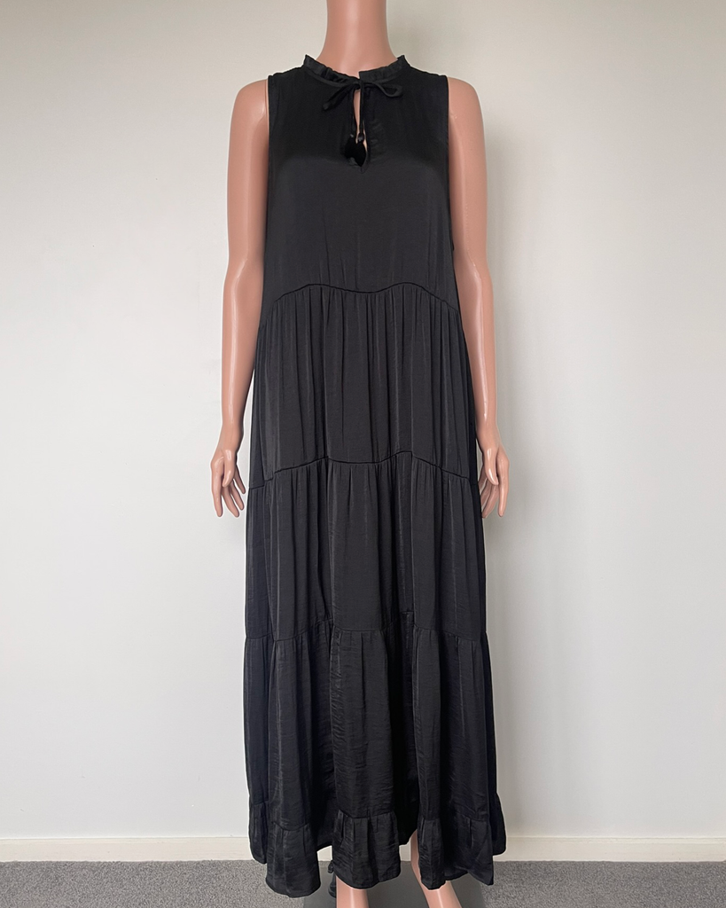 Brand new with tags black tiered dress with tie up neckline and pockets at the hips from Haven.