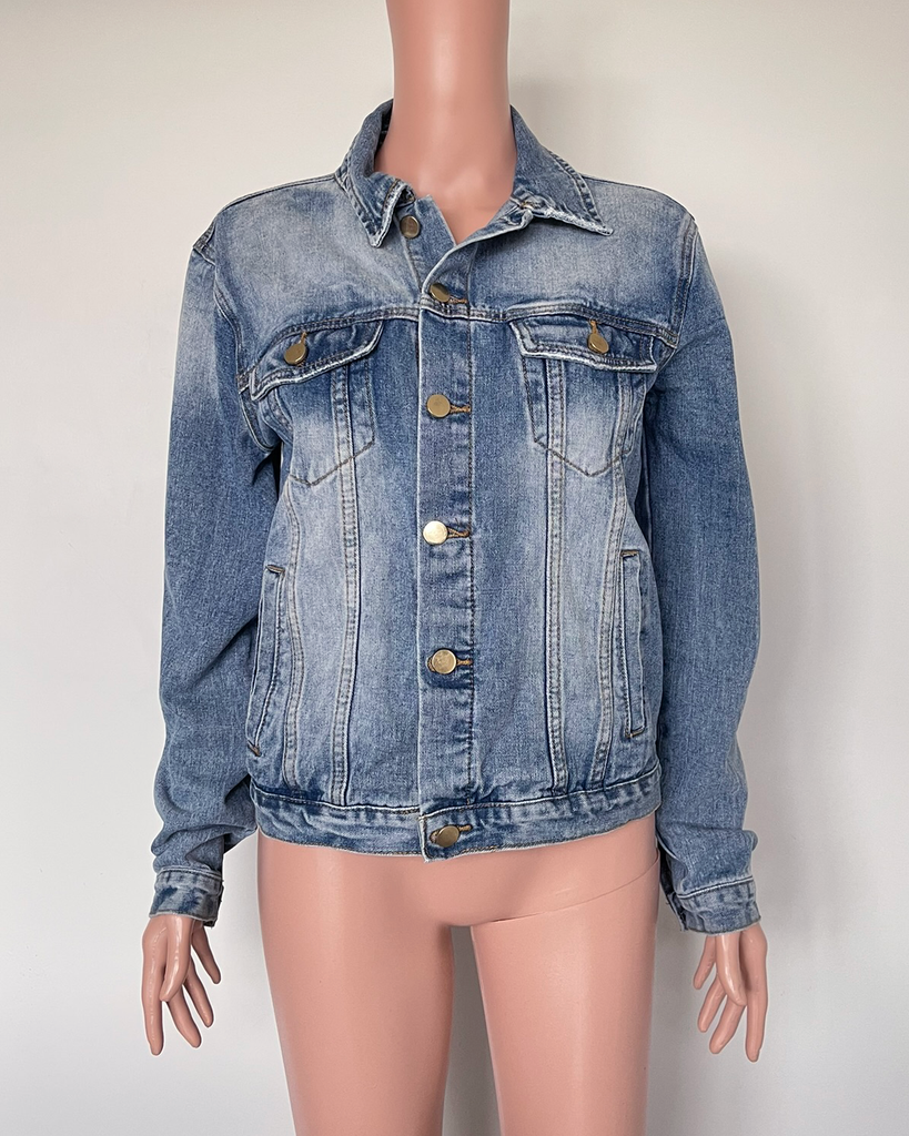 Blue faux aged button up denim jacket with pockets at the hips from Pagani.