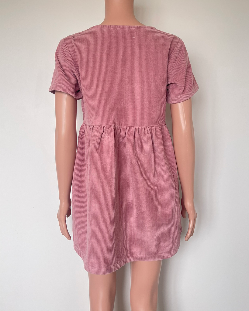 Pink corduroy mini tee dress from Kāpiti based designer Danni Rose.