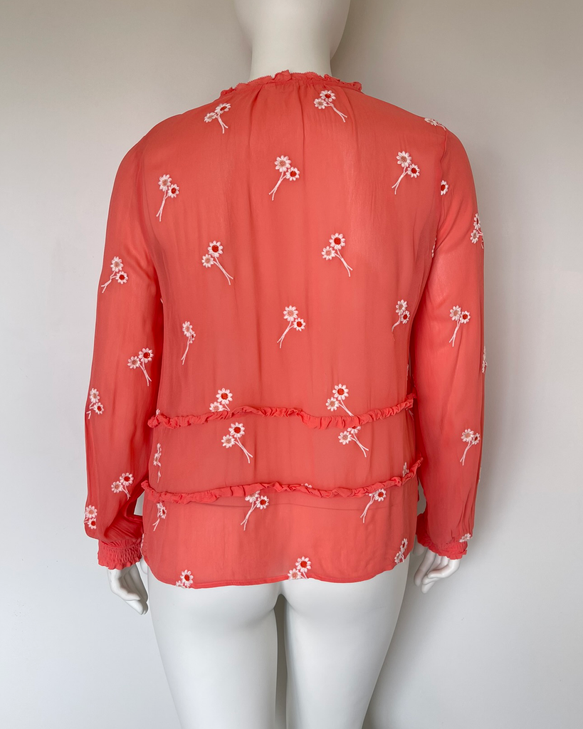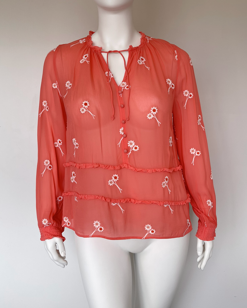 Peach sheer long sleeved top with flowers embroidered all over from UK brand Hush. Original retail price was approximately $140. Please note that the top is a slightly lighter more pinky peach than the photos.