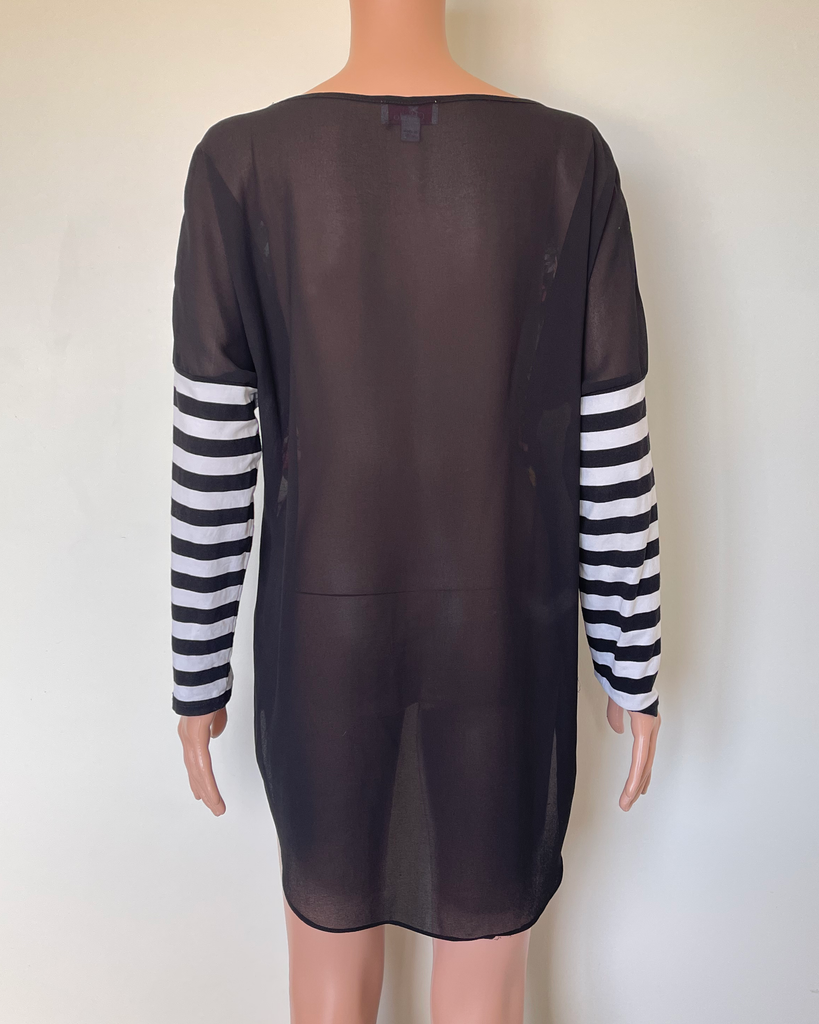 Colourful floral top with black sheer back and black and white striped sleeves from Charlo.