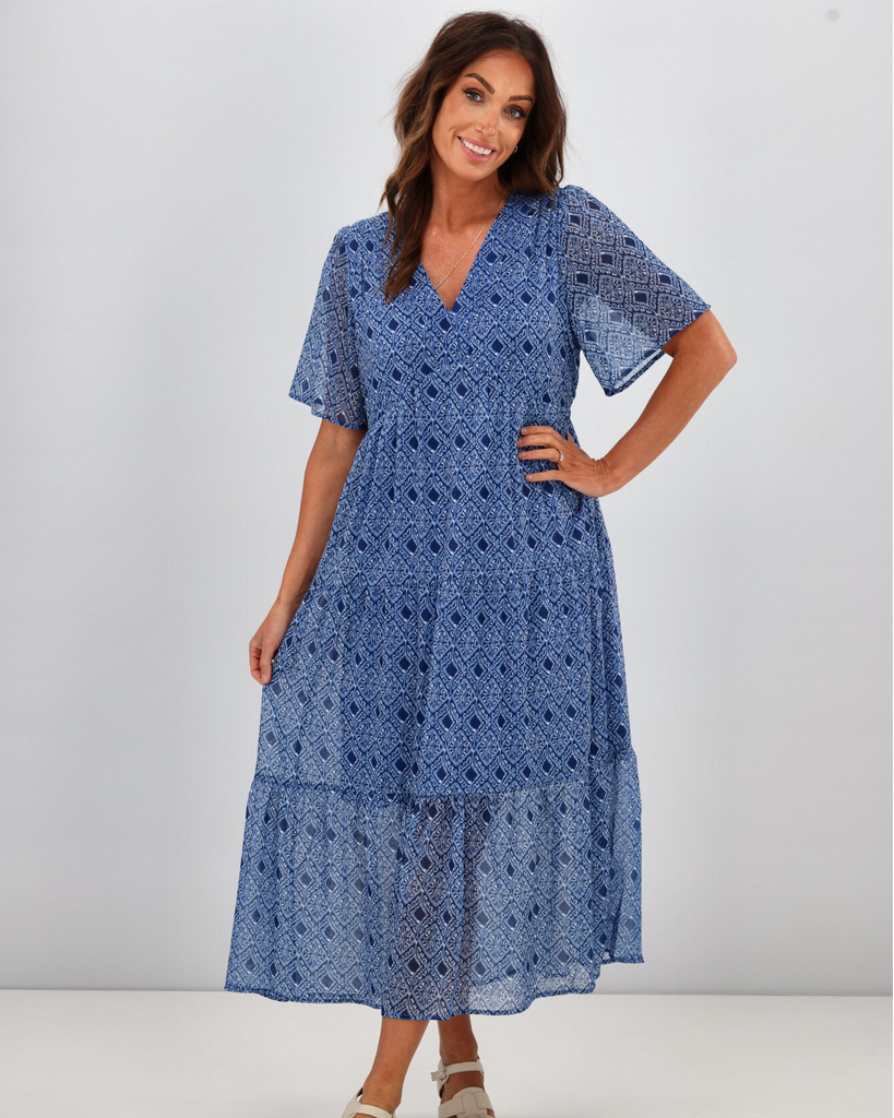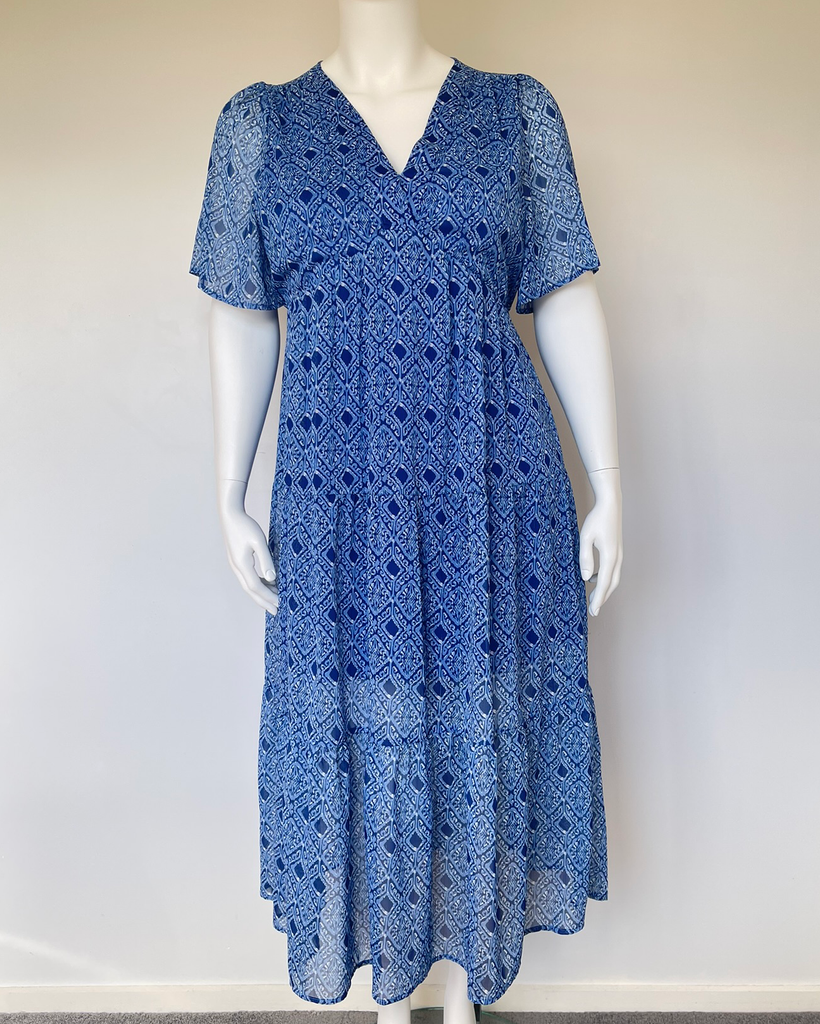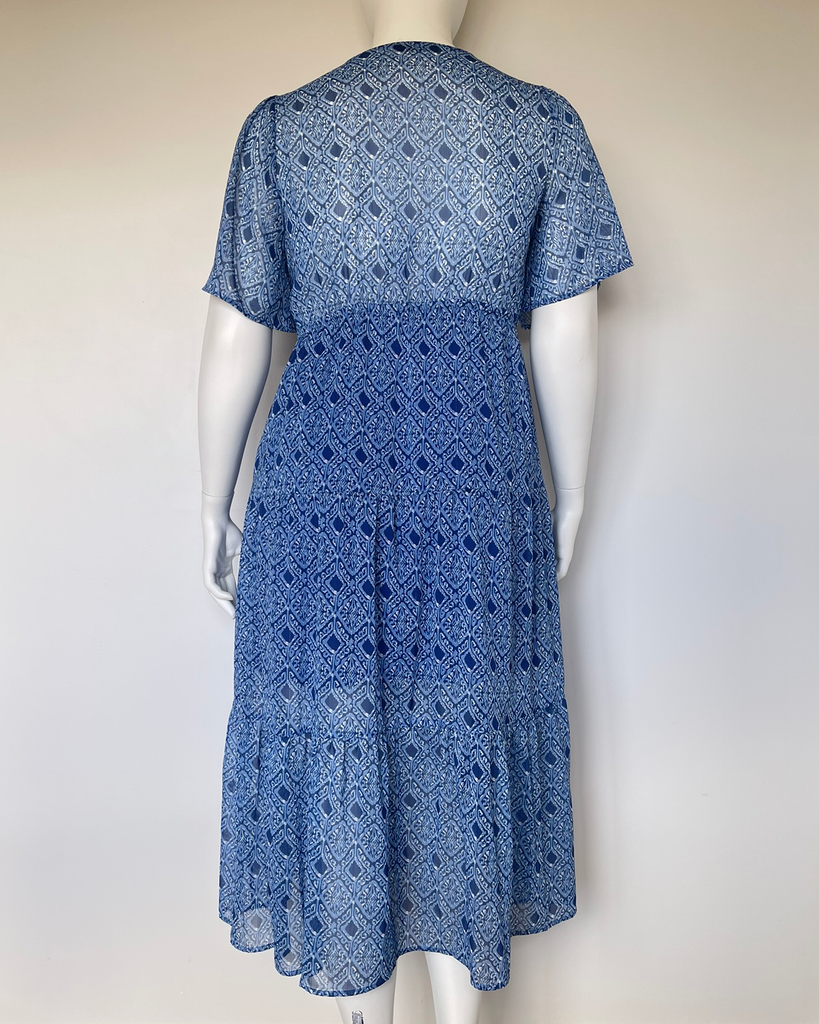 Blue and white (with silver thread throughout) tiered dress with lining to just above the knees and elastic across the back of the waist from Gloss by Shine On.