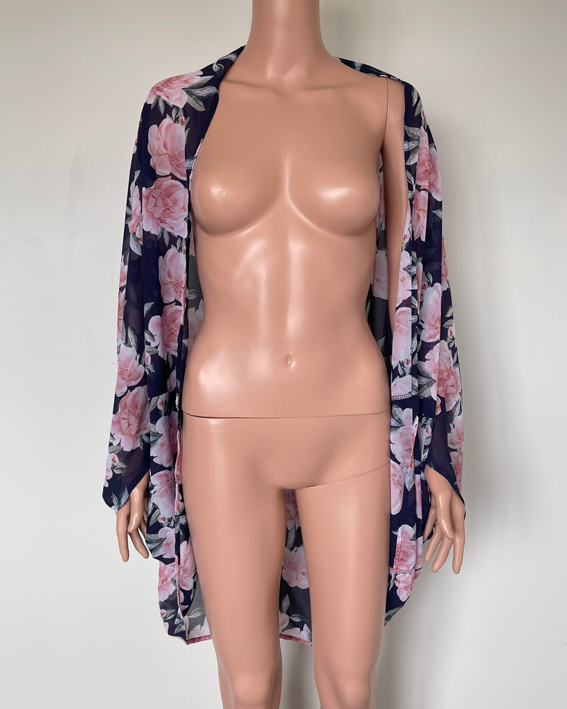 Dark blue and pink sheer floral open duster cardi from Gloss by Shine On.