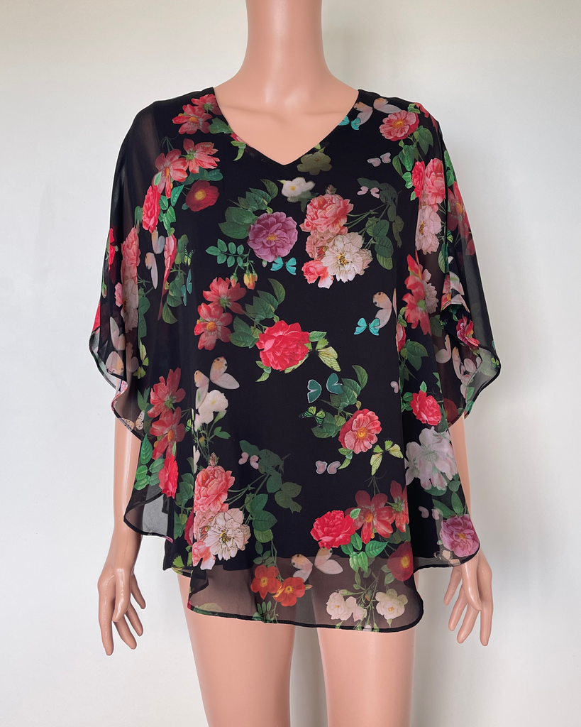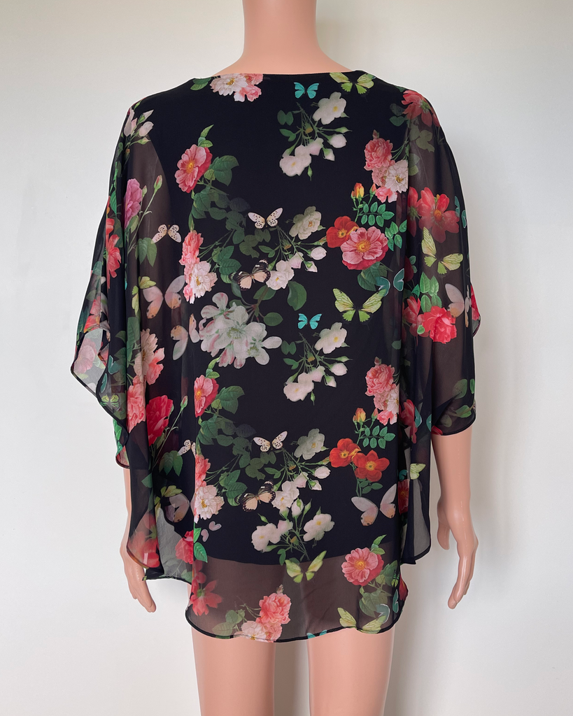 Black, red and green floral and butterfly sheer loose cape style top with black fitted top underneath from Gloss by Shine On.