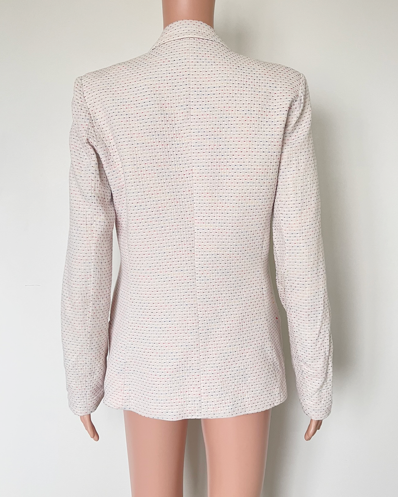 Cream blazer with colourful stitched spots all over, two buttons on the front and pockets at the hips from Ruby brand Madame Hawke.