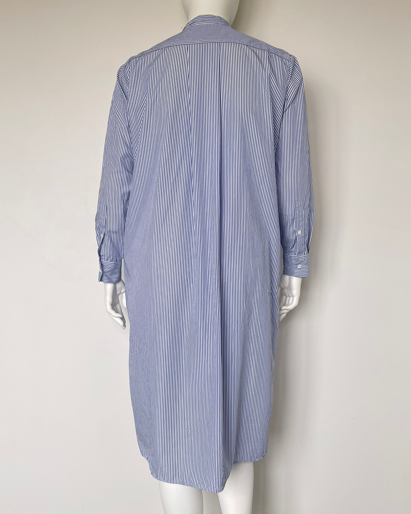 Blue and white long sleeved dress with buttons at the wrists and pockets at the hips from Uniqlo.