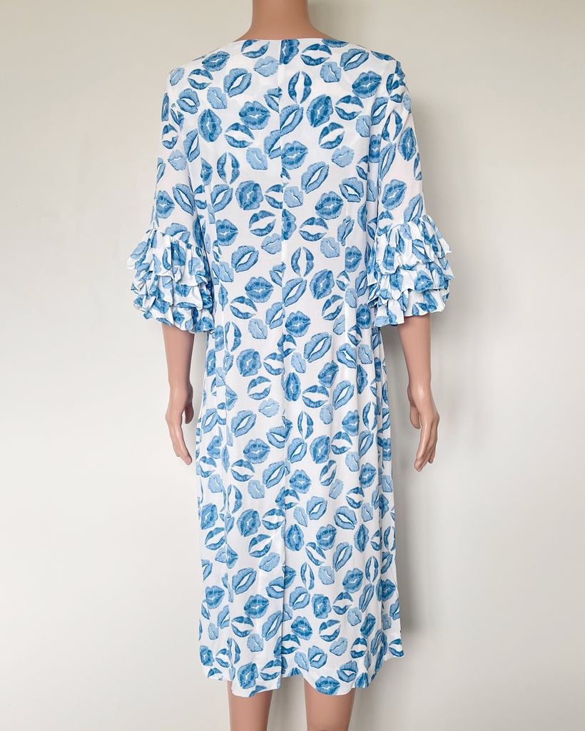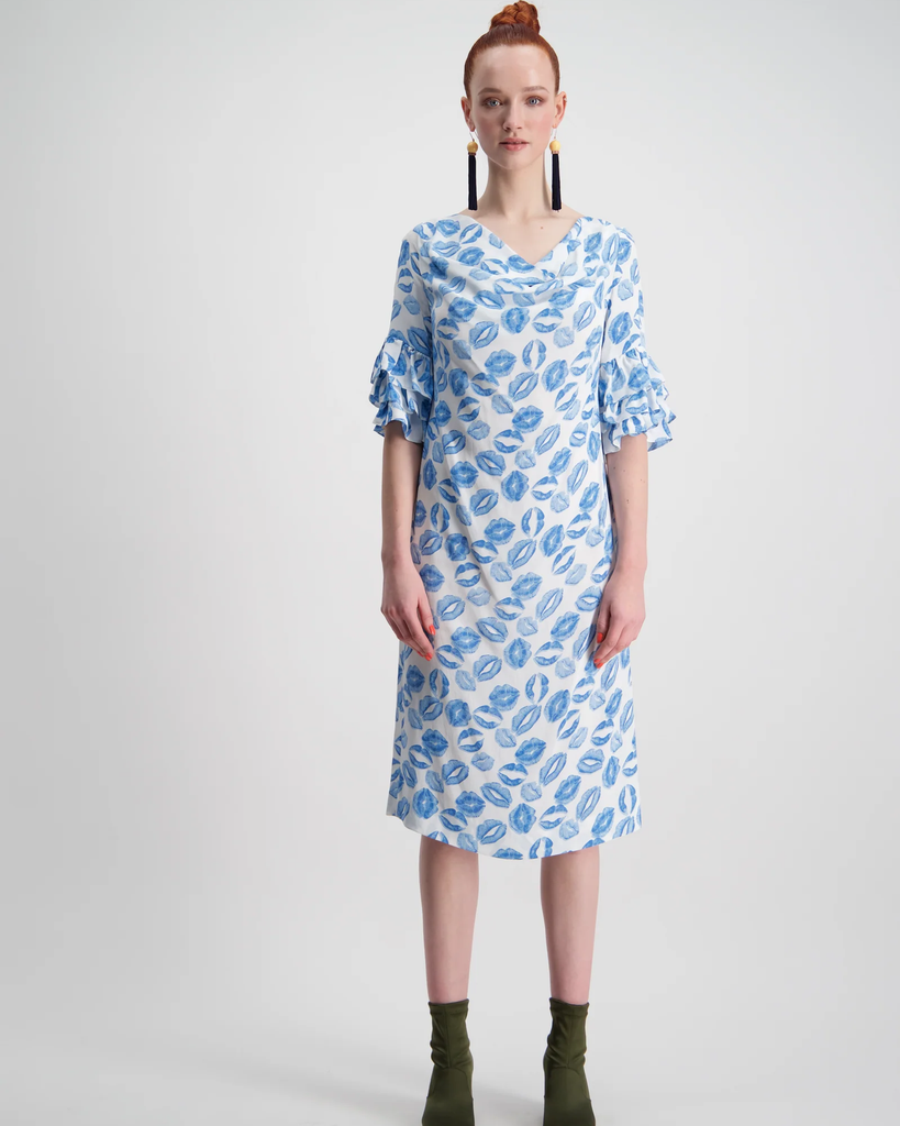 White and blue lip patterned dress with cowl neck, frill sleeves and zip up one side from WORLD. Currently retails for $599 on their website.